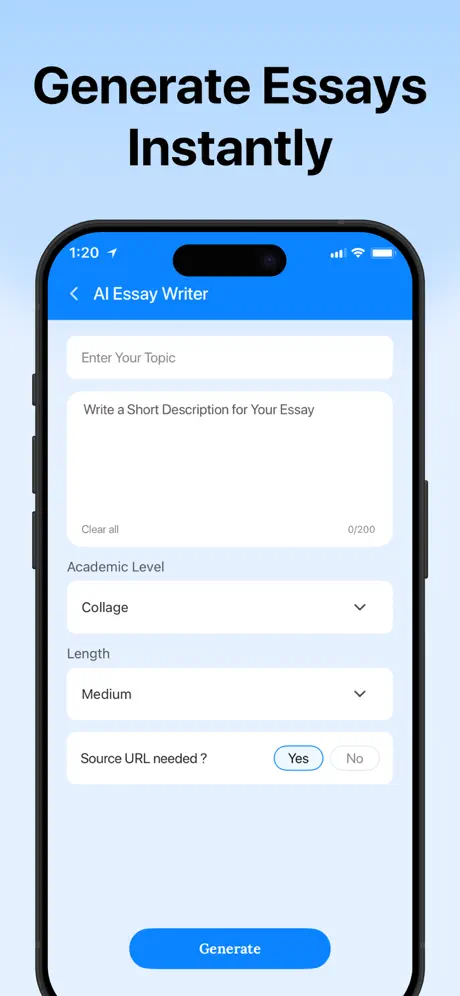 AI Essay Generator — Just enter your topic, choose academic level & length, and get a structured, ready-to-edit essay tailored to your needs.